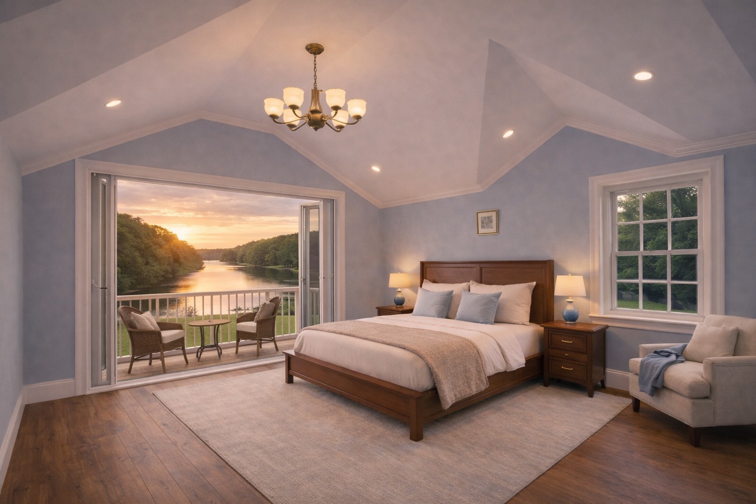 A luxurious principal suite featuring elevated views over the gardens and river, creating a tranquil private retreat
