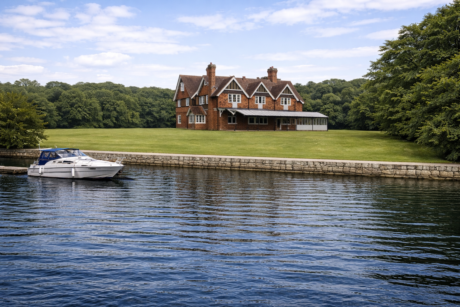 With approximately 55 metres of direct river frontage, expansive grounds, and proximity to Shepperton Studios, the estate occupies a uniquely balanced position — secluded yet remarkably connected, London is 45 mins by car to the West End. Direct trains from Chertsey to Waterloo. Terminal 4 Heathrow 20 mins away.